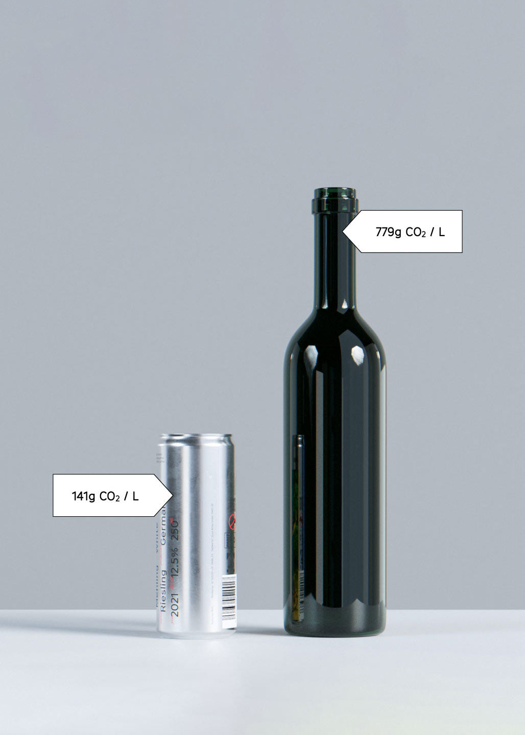 Glass bottles are heavy, fragile, and resource-intensive to produce and recycle. A glass bottle generates over 5x more CO₂ per litre than a can. That’s 779g vs 141g. The math speaks for itself.